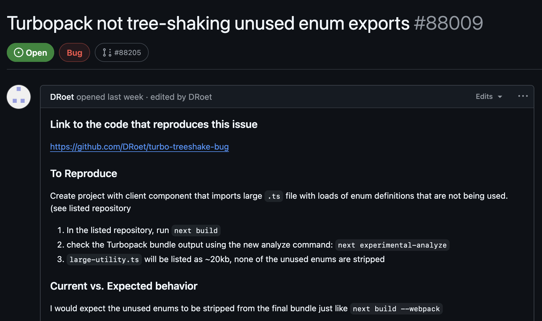 Okay, we now have something we can test. But where do we even begin? This is one reason we chose this bug. It gives a few avenues to go down. First, the report says that these enums are not being "tree-shaken." Is that the right term? One thing I've learned from experience is to never assume that the end user is using terms in the same manner as the codebase. So this can be a starting point, but it might be wrong.