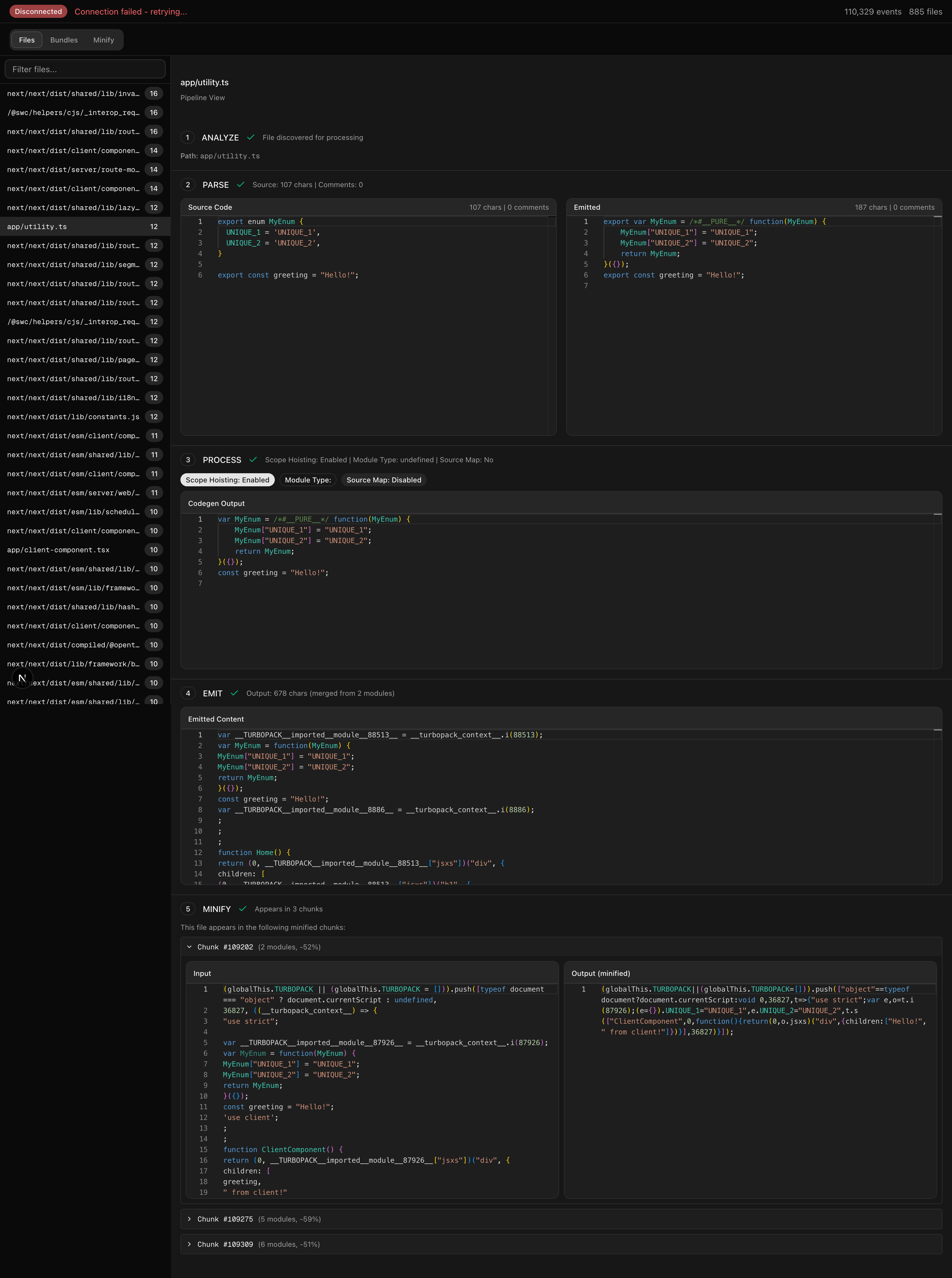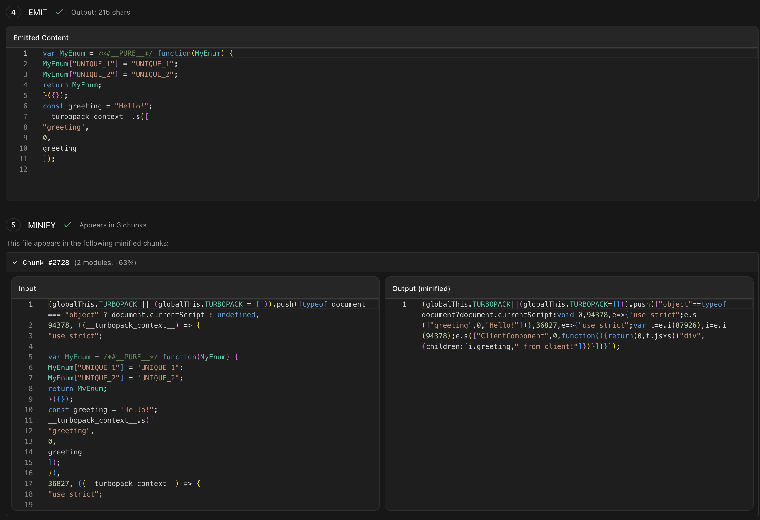 MyEnum here is dead code. It should not show up in our final bundle. But when we do next build and look for it, we get:
